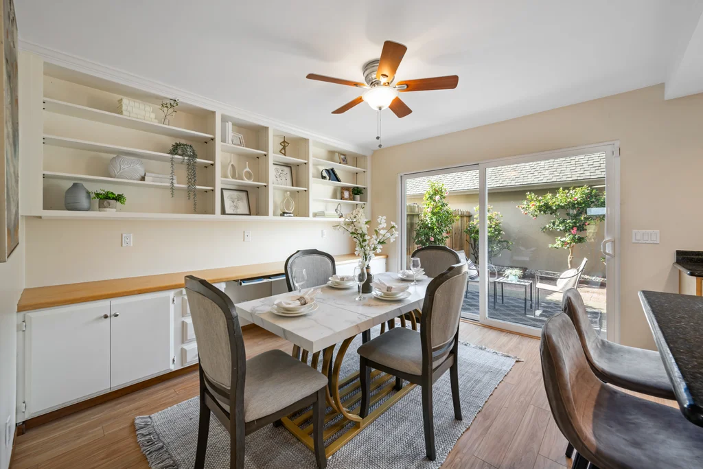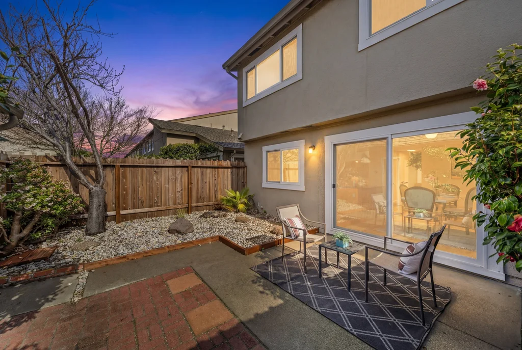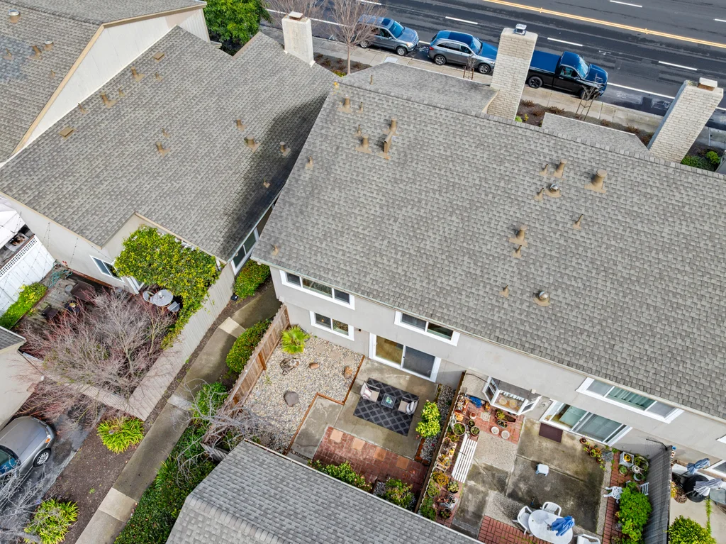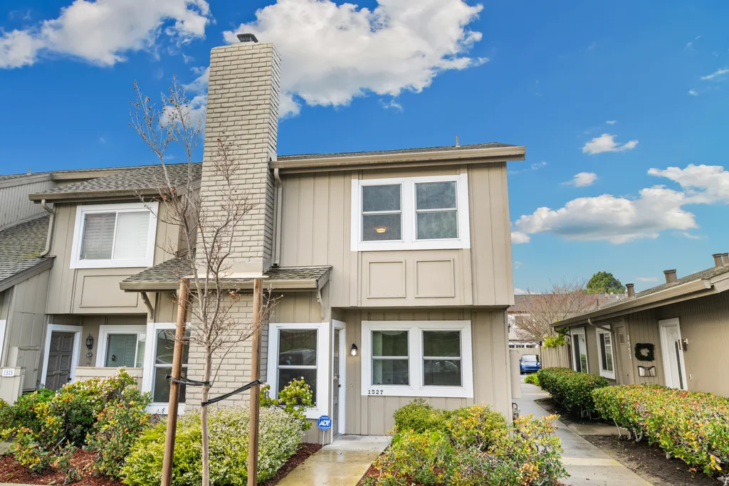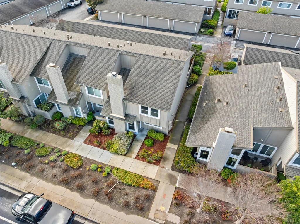 Across from the shoreline, this two-story townhouse offers coastal living with walkable access to the Bay Trail, downtown shopping, dining, and the beach. The main level features a bright living room with electric fireplace, double-door office enclosure, adjacent half bath, and functional flow between living spaces. The updated kitchen includes modern finishes and sliding glass doors that open to a private outdoor patio with convenient access to the laundry area. Upstairs, a spacious bath showcases a glass-enclosed shower with designer tile detailing, while the primary bedroom enjoys views of the Bay and additional bedrooms provide abundant natural light. A detached two-car garage adds valuable storage and parking.