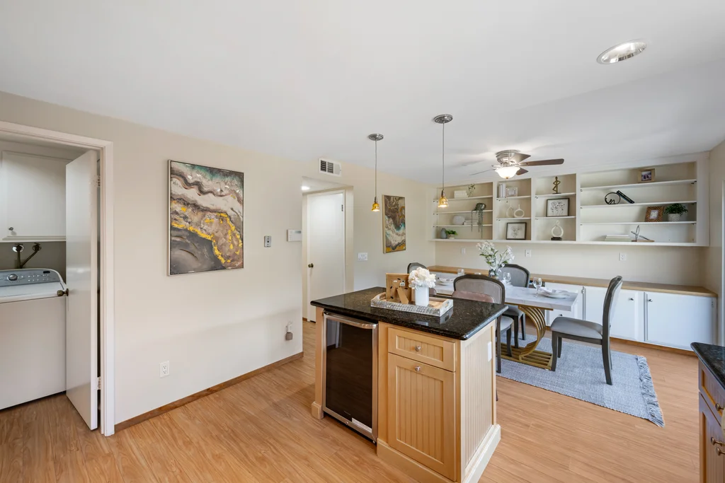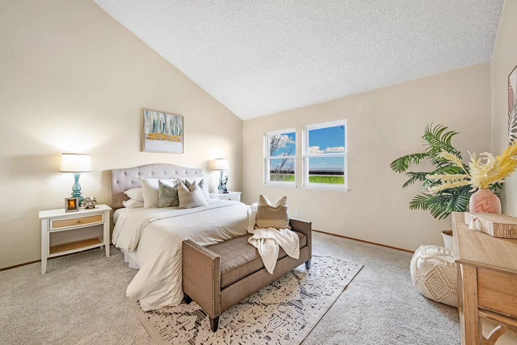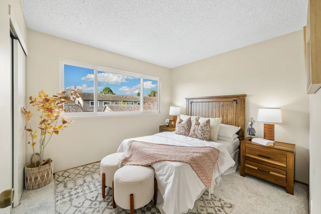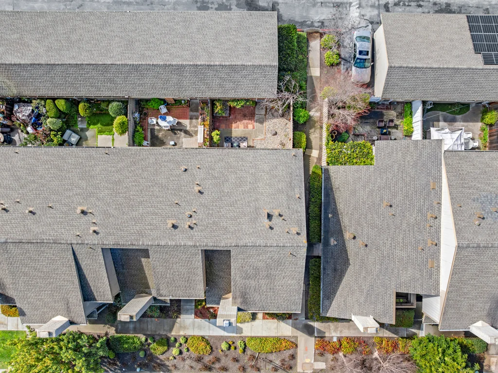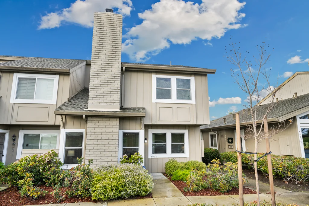 Across from the shoreline, this two-story townhouse offers coastal living with walkable access to the Bay Trail, downtown shopping, dining, and the beach. The main level features a bright living room with electric fireplace, double-door office enclosure, adjacent half bath, and functional flow between living spaces. The updated kitchen includes modern finishes and sliding glass doors that open to a private outdoor patio with convenient access to the laundry area. Upstairs, a spacious bath showcases a glass-enclosed shower with designer tile detailing, while the primary bedroom enjoys views of the Bay and additional bedrooms provide abundant natural light. A detached two-car garage adds valuable storage and parking.
